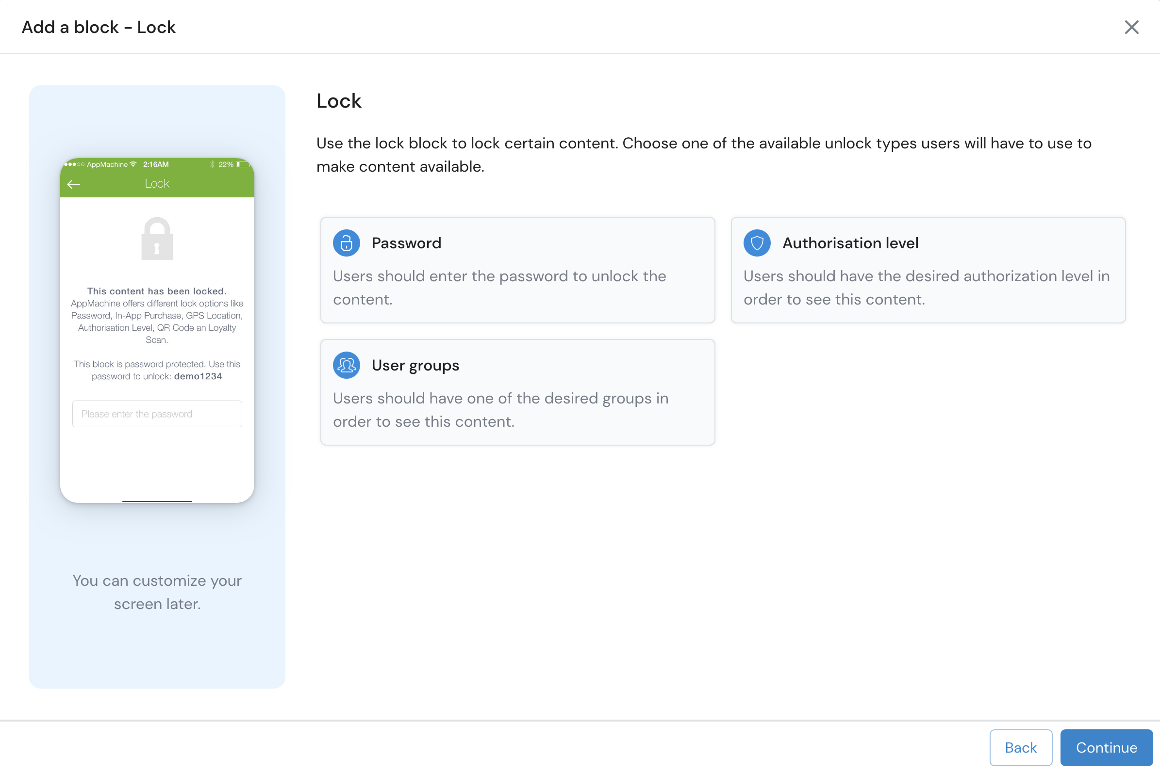 Allows you to lock certain content unless the app user meets certain requirements. The block can be unlocked using a password, authorization level or User Group members.&#x20;