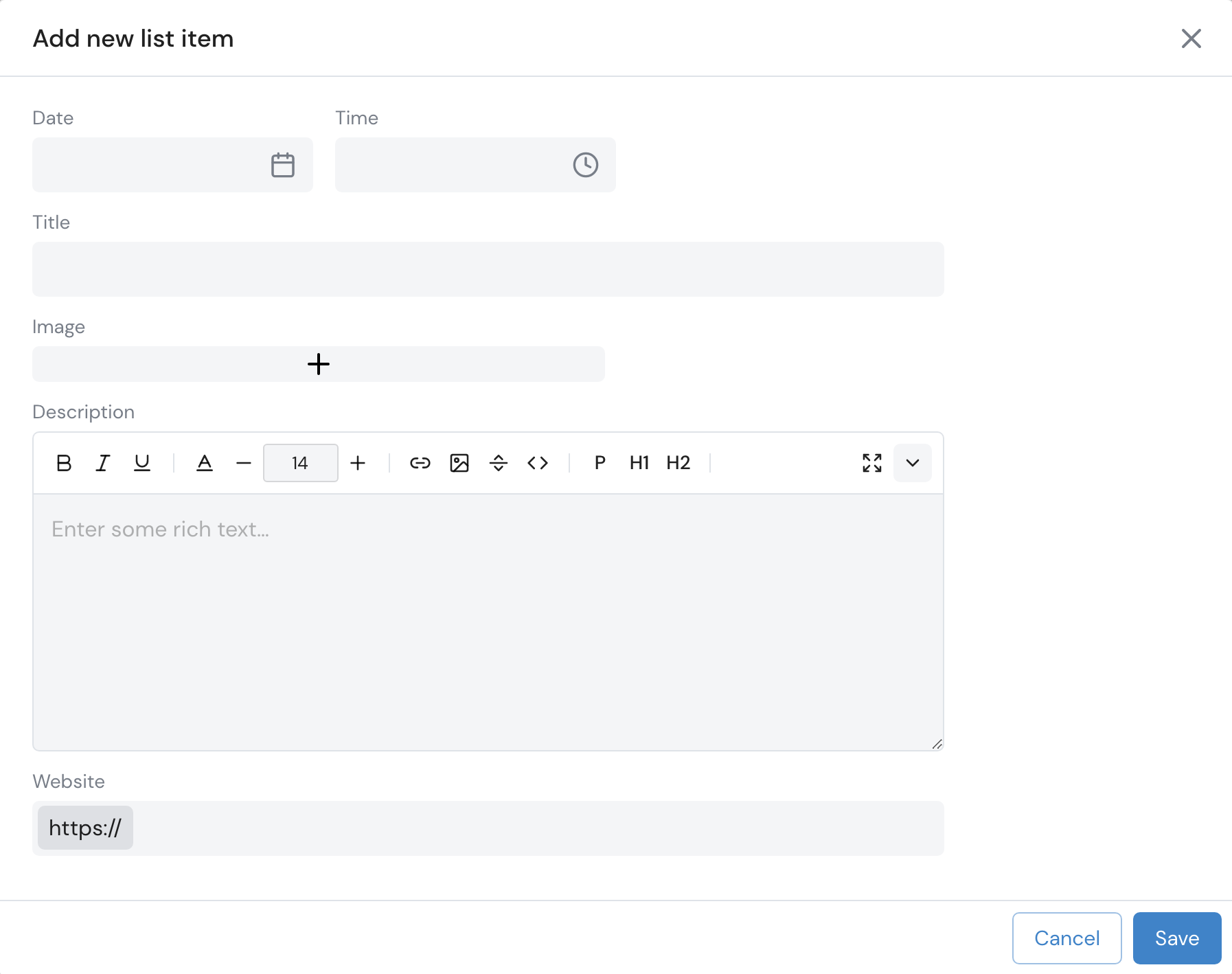 2. Enter the **Date**, **Time**, **Title**, **Image**, **Description**, and **Website** to the wizard.&#x20;