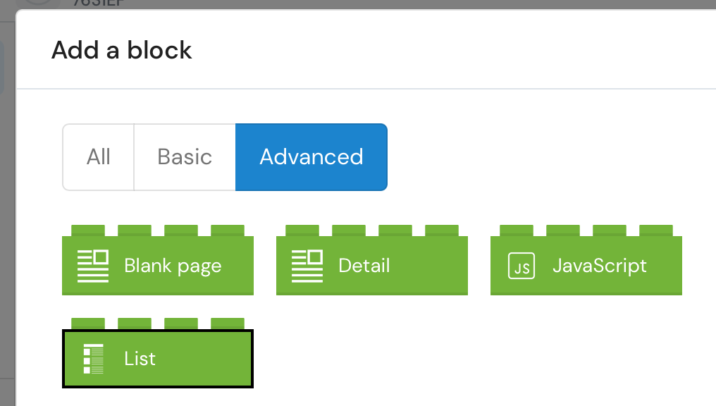 4. Select the **List** to show a list of items in a screen. The detail page will be added automatically\ <img src="https://2636455530-files.gitbook.io/~/files/v0/b/gitbook-x-prod.appspot.com/o/spaces%2F2wzy1sO41plYrfJfaAhN%2Fuploads%2F1FVPSJJqDRLudnU8fH8p%2Fimage.png?alt=media&#x26;token=3e6aa7d3-0111-41ec-8a60-2b539f8c4c27" alt="" data-size="original">